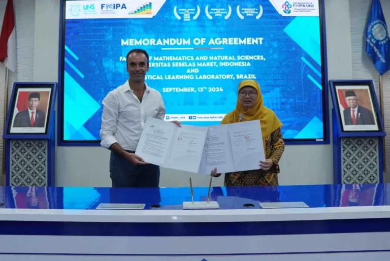 FMIPA UNS – Fakultas Matematika dan Ilmu Pengetahuan Alam (FMIPA) Universitas Sebelas Maret (UNS) Surakarta menjalin kerjasama dengan The Statistical Learning Laboratory (SaLLy) Federal University of Bahia, Brazil. Penandatanganan perjanjian kerjasama dilaksanakan di Ruang Sidang Senat Lt. 1 Gedung Soetomo Darsowiratmo FMIPA pada hari Jumat (13/9/2024) oleh Kepala Statistical Learning Laboratory, Prof. Dr. Paulo Canas Rodrigues dan Dekan FMIPA UNS, Dr. Desi Suci Handayani, S.Si., M.Si.
